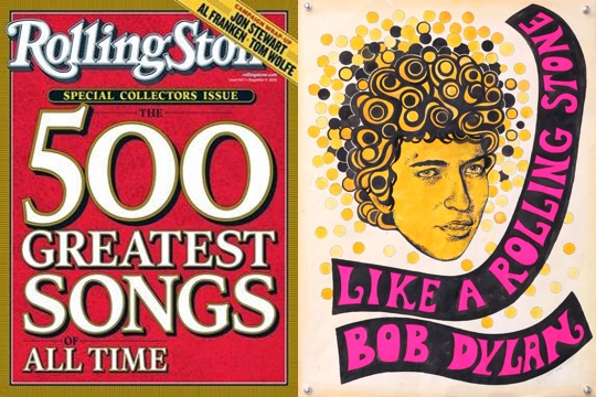 Bob Dylan - Like a Rolling Stone The Rolling Stones - Satisfaction John Lennon - Imagine Marvin Gaye - What's Going On Aretha Franklin - Respect The Beach Boys - Good Vibrations Chuck Berry - Johnny B. Goode The Beatles - Hey Jude Nirvana - Smells Like Teen Spirit Ray Charles - What'd I Say The Who - My Generation Sam Cooke - A Change Is Gonna Come The Beatles - Yesterday Bob Dylan - Blowin' in the Wind The Clash - London Calling The Beatles - I Want to Hold Your Hand Jimi Hendrix - Purple Haze Chuck Berry - Maybellene Elvis Presley - Hound Dog The Beatles - Let It Be Bruce Springsteen - Born to Run The Ronettes - Be My Baby The Beatles - In My Life The Impressions - People Get Ready The Beach Boys - God Only Knows The Beatles - A Day in the Life Derek and the Dominos - Layla Otis Redding - (Sittin on) the Dock of the Bay The Beatles - Help! Johnny Cash - I Walk the Line Led Zeppelin - Stairway To Heaven The Rolling Stones - Sympathy for the Devil Ike and Tina Turner - River Deep – Mountain High The Righteous Brothers - You've Lost That Lovin' Feelin' The Doors - Light My Fire U2 - One Bob Marley and the Wailers - No Woman, No Cry The Rolling Stones - Gimme Shelter Buddy Holly and the Crickets - That'll Be the Day Martha and the Vandellas - Dancing in the Street The Band - The Weight The Kinks - Waterloo Sunset Little Richard - Tutti Frutti Ray Charles - Georgia on My Mind Elvis Presley - Heartbreak Hotel David Bowie - Heroes Simon and Garfunkel - Bridge Over Troubled Water Jimi Hendrix - All Along the Watchtower The Eagles - Hotel California Smokey Robinson and the Miracles - The Tracks of My Tears Grandmaster Flash and the Furious Five - The Message Prince - When Doves Cry The Sex Pistols - Anarchy in the U.K. Percy Sledge - When a Man Loves a Woman The Kingsmen - Louie Louie Little Richard - Long Tall Sally Procol Harum - Whiter Shade of Pale Michael Jackson - Billie Jean Bob Dylan - The Times They Are A-Changin' Al Green - Let's Stay Together Jerry Lee Lewis - Whole Lotta Shakin' Goin On Bo Diddley - Bo Diddley Buffalo Springfield - For What It's Worth The Beatles - She Loves You Cream - Sunshine of Your Love Bob Marley and the Wailers - Redemption Song Elvis Presley - Jailhouse Rock Bob Dylan - Tangled Up in Blue Roy Orbison - Crying Dionne Warwick - Walk On By The Beach Boys - California Girls James Brown - Papa's Got a Brand New Bag Eddie Cochran - Summertime Blues Stevie Wonder - Superstition Led Zeppelin - Whole Lotta Love The Beatles - Strawberry Fields Forever Elvis Presley - Mystery Train James Brown - I Got You (I Feel Good) The Byrds - Mr. Tambourine Man Marvin Gaye - I Heard It Through the Grapevine Fats Domino - Blueberry Hill The Kinks - You Really Got Me The Beatles - Norwegian Wood (This Bird Has Flown) The Police - Every Breath You Take Patsy Cline - Crazy Bruce Springsteen - Thunder Road Johnny Cash - Ring of Fire The Temptations - My Girl The Mamas and The Papas - California Dreamin' The Five Satins - In the Still of the Nite Elvis Presley - Suspicious Minds Ramones - Blitzkrieg Bop U2 - I Still Haven't Found What I'm Looking For Little Richard - Good Golly, Miss Molly Carl Perkins - Blue Suede Shoes Jerry Lee Lewis - Great Balls of Fire Chuck Berry - Roll Over Beethoven Al Green - Love and Happiness Creedence Clearwater Revival - Fortunate Son The Rolling Stones - You Can't Always Get What You Want Jimi Hendrix - Voodoo Child (Slight Return) Gene Vincent and His Blue Caps - Be-Bop-A-Lula Donna Summer - Hot Stuff Stevie Wonder - Living for the City Simon and Garfunkel - The Boxer Bob Dylan - Mr. Tambourine Man Buddy Holly and the Crickets - Not Fade Away Prince - Little Red Corvette Van Morrison - Brown Eyed Girl Otis Redding - I've Been Loving You Too Long (to Stop Now) Hank Williams - I'm So Lonesome I Could Cry Elvis Presley - That's All Right The Drifters - Up on the Roof The Crystals - Da Doo Ron Ron (When He Walked Me Home) Sam Cooke - You Send Me The Rolling Stones - Honky Tonk Women Al Green - Take Me to the River The Isley Brothers - Shout (Parts 1 and 2) Fleetwood Mac - Go Your Own Way The Jackson 5 - I Want You Back Ben E. King - Stand By Me The Animals - House of the Rising Sun James Brown - It's a Man's Man's Man's World The Rolling Stones - Jumpin' Jack Flash The Shirelles - Will You Love Me Tomorrow Big Joe Turner - Shake, Rattle & Roll David Bowie - Changes Chuck Berry - Rock & Roll Music Steppenwolf - Born to Be Wild Rod Stewart - Maggie May U2 - With or Without You Bo Diddley - Who Do You Love The Who - Won't Get Fooled Again Wilson Pickett - In the Midnight Hour The Beatles - While My Guitar Gently Weeps Elton John - Your Song The Beatles - Eleanor Rigby Sly and the Family Stone - Family Affair The Beatles - I Saw Her Standing There Led Zeppelin - Kashmir The Everly Brothers - All I Have to Do Is Dream James Brown - Please, Please, Please Prince - Purple Rain The Ramones - I Wanna Be Sedated Sly and the Family Stone - Everyday People The B-52's - Rock Lobster Iggy Pop - Lust for Life Janis Joplin - Me and Bobby McGee The Everly Brothers - Cathy's Clown The Byrds - Eight Miles High The Penguins - Earth Angel Jimi Hendrix - Foxey Lady The Beatles - A Hard Day's Night Buddy Holly and the Crickets - Rave On Creedence Clearwater Revival - Proud Mary Simon and Garfunkel - The Sound of Silence The Flamingos - I Only Have Eyes for You Bill Haley and His Comets - (We're Gonna) Rock Around the Clock The Velvet Underground - I'm Waiting for the Man Public Enemy - Bring the Noise Ray Charles - I Can't Stop Loving You Sinead O'Connor - Nothing Compares 2 U Queen - Bohemian Rhapsody Johnny Cash - Folsom Prison Blues Tracy Chapman - Fast Car Eminem - Lose Yourself Marvin Gaye - Let's Get It On The Temptations - Papa Was a Rollin' Stone R.E.M. - Losing My Religion Joni Mitchell - Both Sides Now Abba - Dancing Queen Aerosmith - Dream On The Sex Pistols - God Save the Queen The Rolling Stones - Paint It, Black The Bobby Fuller Four - I Fought the Law The Beach Bo